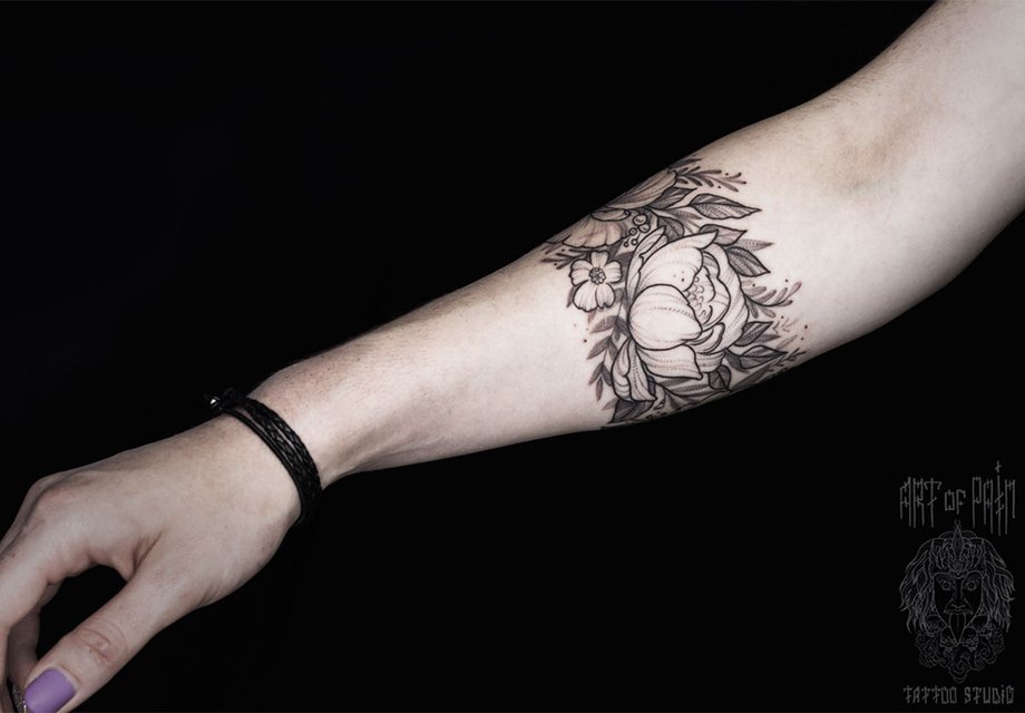Татуировка женская графика на предплечье браслет из цветов 2317