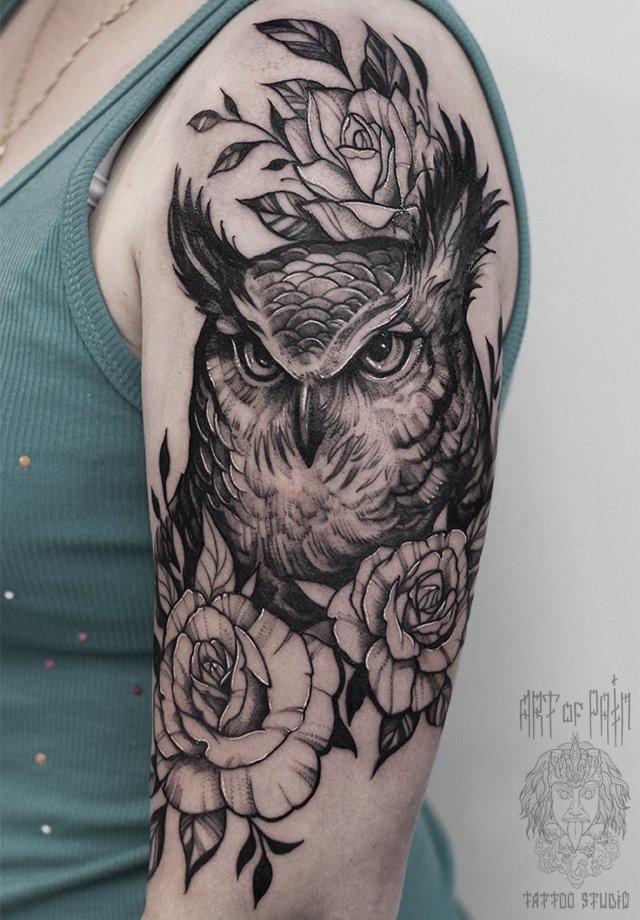Татуировка женская графика на плече сова 2347