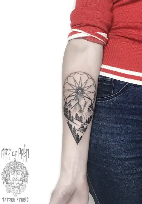 Татуировка женская графика на предплечье пейзаж и колесо 2362