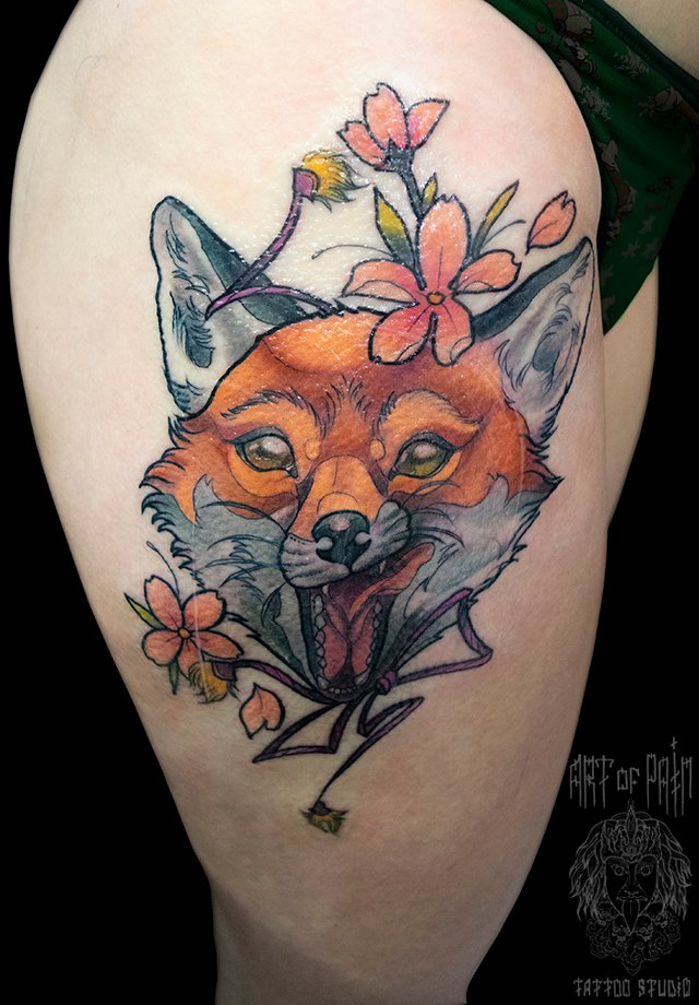 Татуировка женская нью-скул на бедре лиса 2371