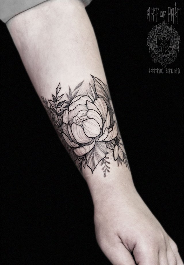 Татуировка женская графика/дотворк на предплечье пион 2434