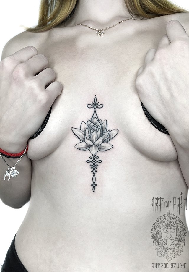 Татуировка женская графика на груди лотос и узор 2439