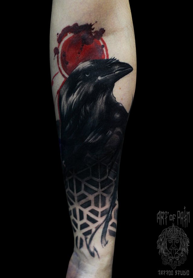 Татуировка женская реализм на предплечье ворон 2486