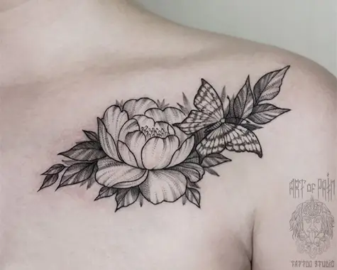 Татуировка женская графика на ключице цветок с бабочкой 2500