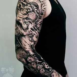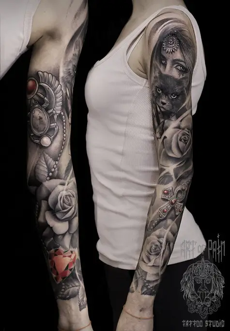 Татуировка женская black&grey на тату-рукав скарабей, девушка, кошка, анкх (Слава Tech Lunatic) 2503