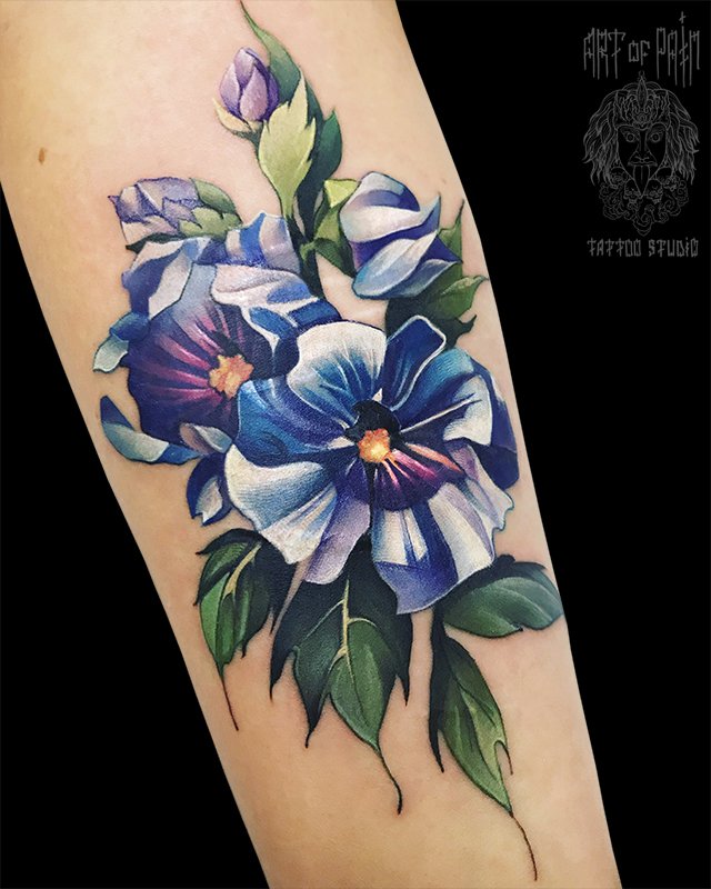 Татуировка женская реализм на предплечье синие цветы 2505