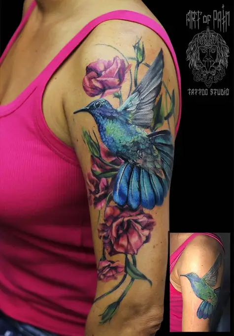 Татуировка женская реализм на плече колибри кавер 2512