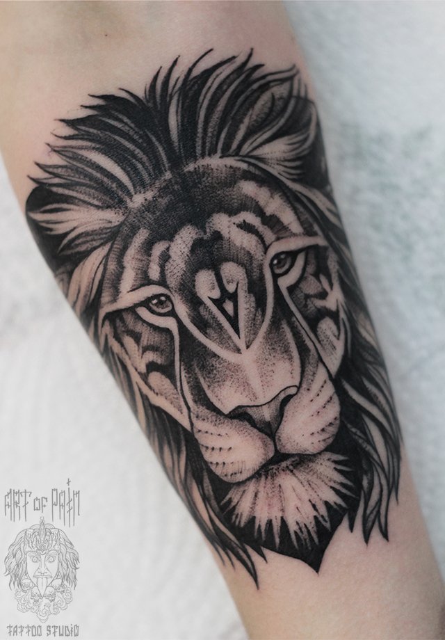 Татуировка женская графика и дотворк на предплечье лев 2529