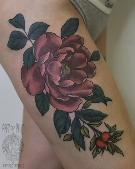 Татуировка женская нью-скул на бедре цветок и плоды шиповника (Анастасия Родина) 2576