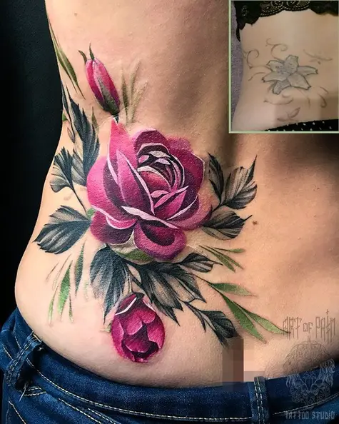 Татуировка женская нью-скул на спине цветы кавер 2579