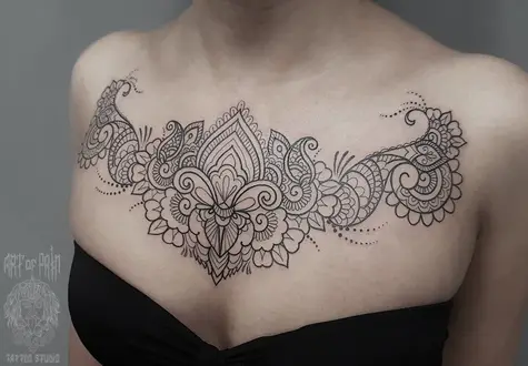 Татуировка женская орнаментал на ключицах и груди узор 2592