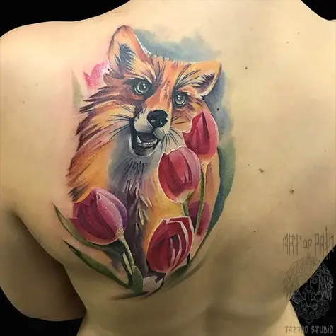 Татуировка женская нью-скул на спине лиса в тюльпанах 2625