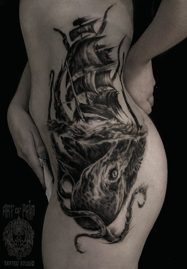 Татуировка женская хоррор на боку корабль и осьминог 2631
