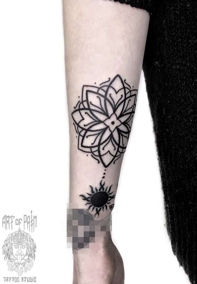 Татуировка женская орнаментал на предплечье мандала и солнце 2638