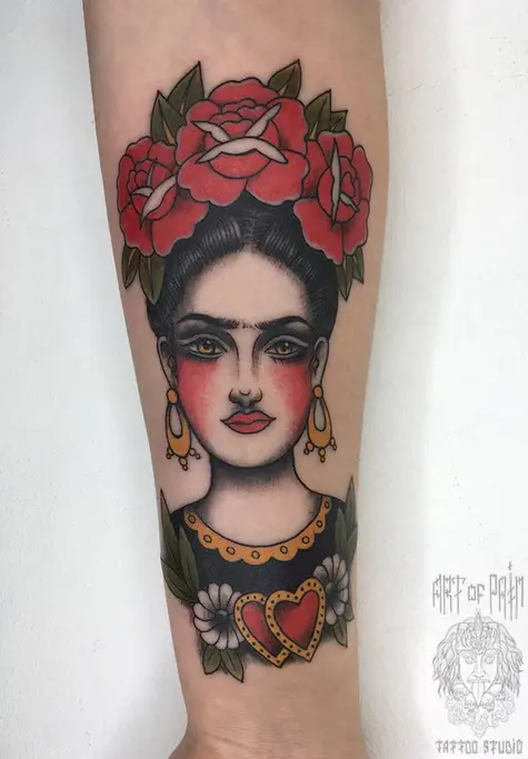 Татуировка женская олд-скул на предплечье фрида кало (Анастасия Родина) 2652