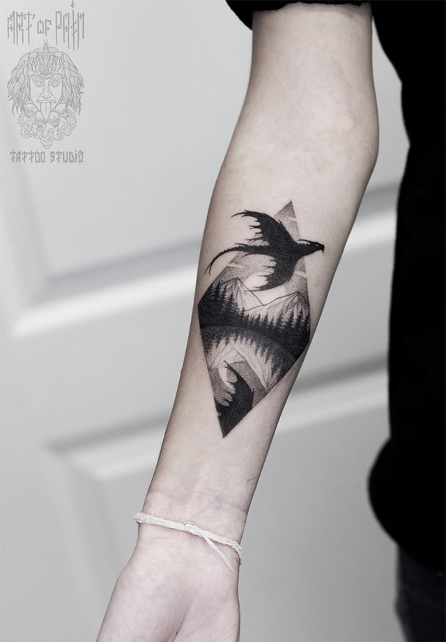 Татуировка женская графика на предплечье дракон, пейзаж 2674