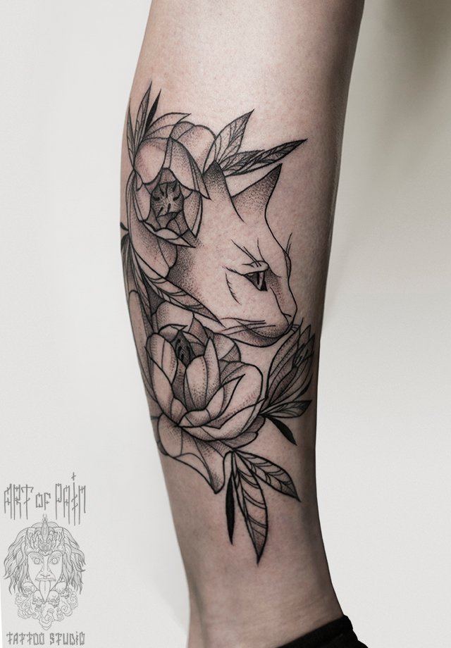 Татуировка женская графика на голени кошка 2702