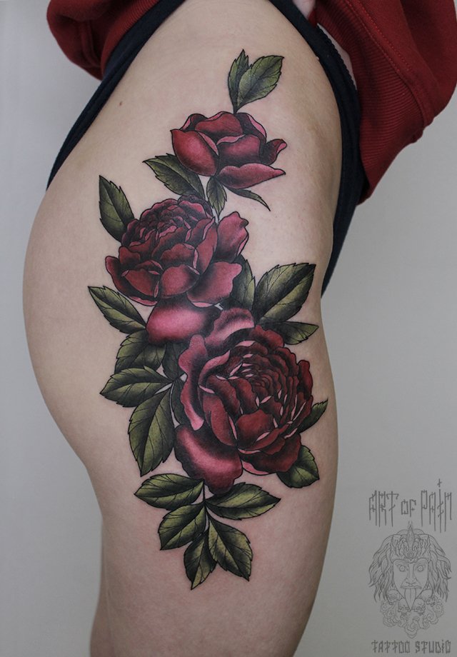 Татуировка женская нью-скул на бедре розы (Анастасия Родина) 2718