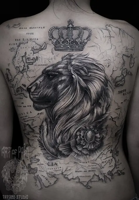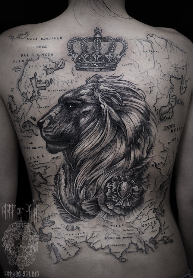 Татуировка женская black&grey на спине лев и карта (Слава Tech Lunatic) 2748