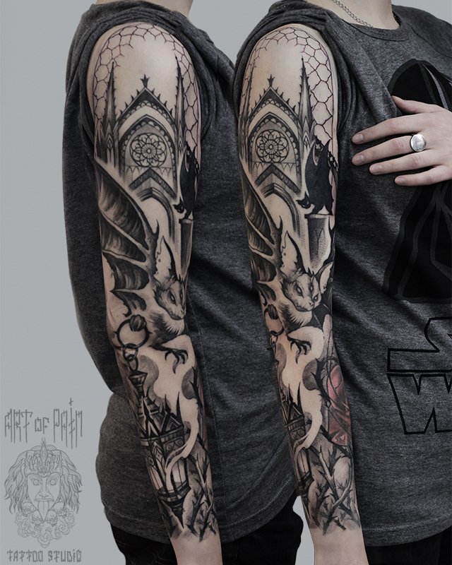 Татуировка женская графика тату-рукав летучая мышь 2769