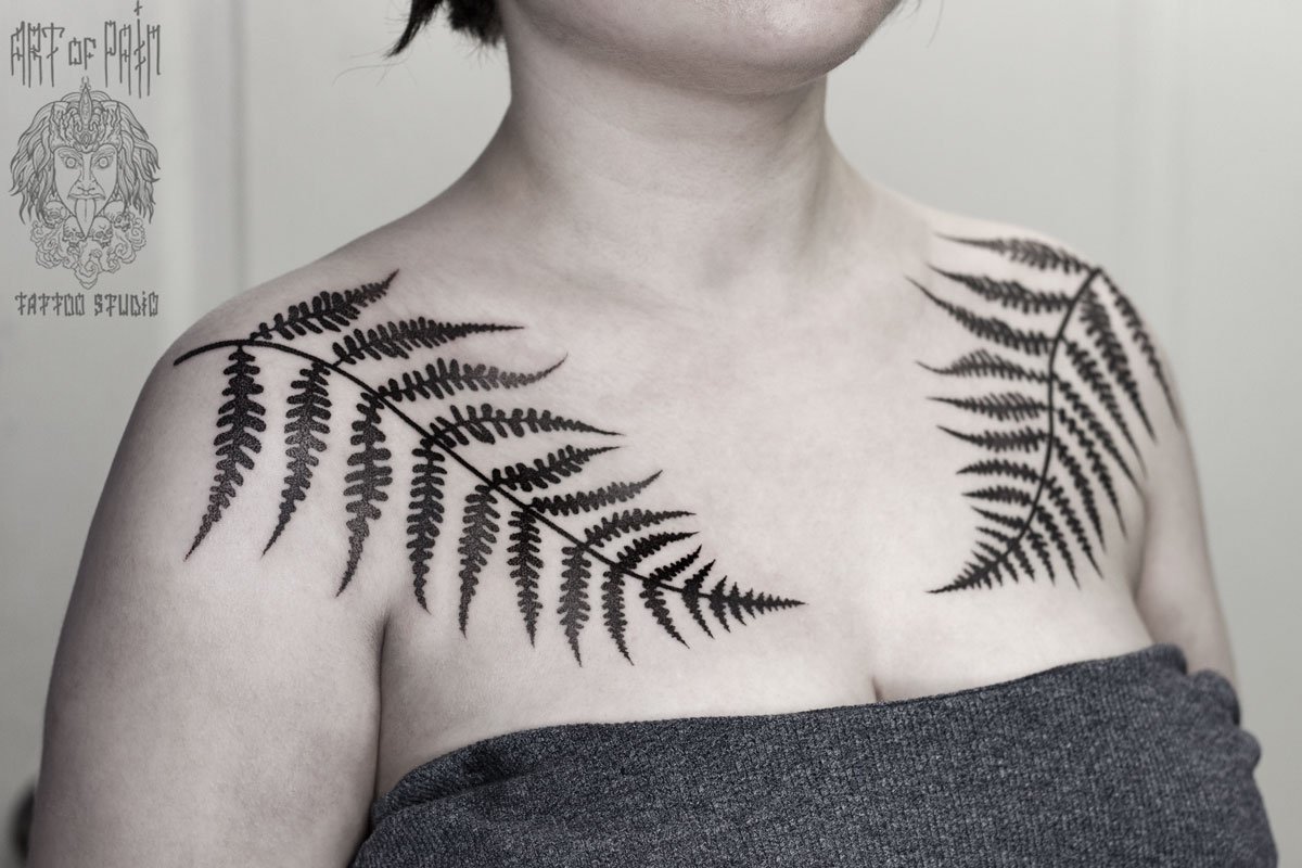 Татуировка женская графика на груди папоротник 2781