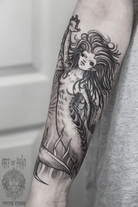 Татуировка женская графика на предплечье русалка 2787