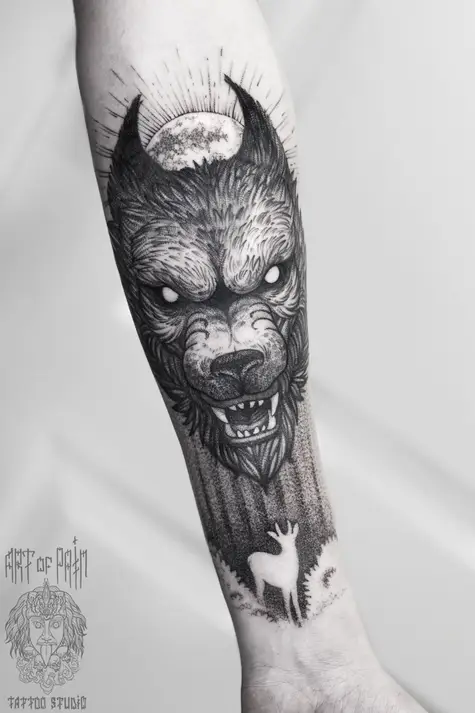Татуировка женская графика на предплечье волк и силуэт олененка 2791