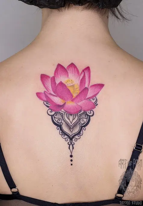 Татуировка женская нью скул на спине лотос (Анастасия Родина) 2815