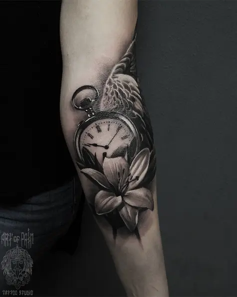 Татуировка женская black&grey на предплечье часы с цветком 2873