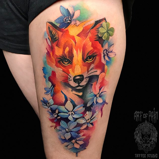 Татуировка женская нью-скул на бедре лиса с четырехлистным клевером 2917