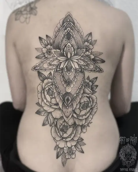 Татуировка женская графика на спине орнамент и пионы 2933
