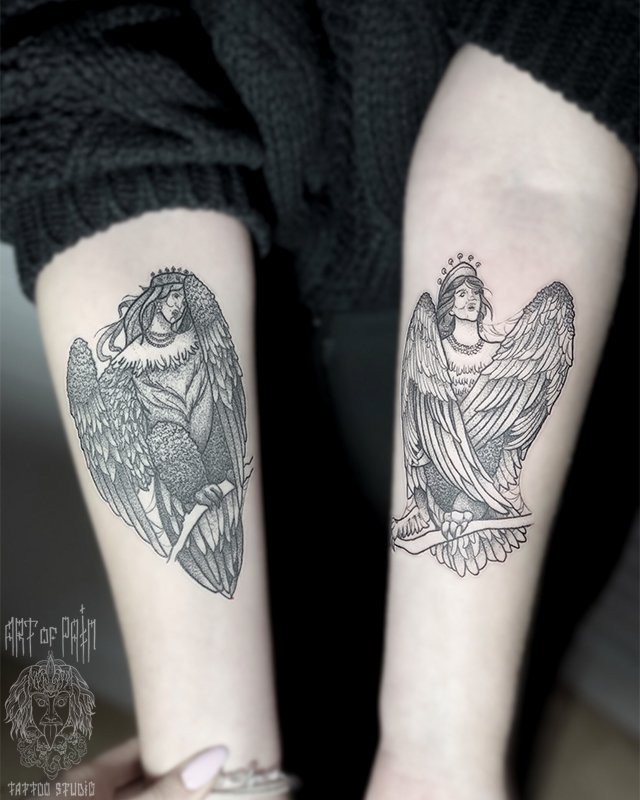 Татуировка женская графика на предплечье сирин и алконост 2947