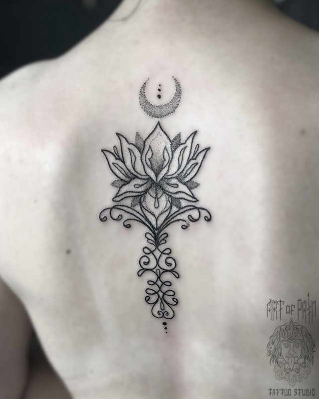 Татуировка женская графика на спине узор лотоса 2949