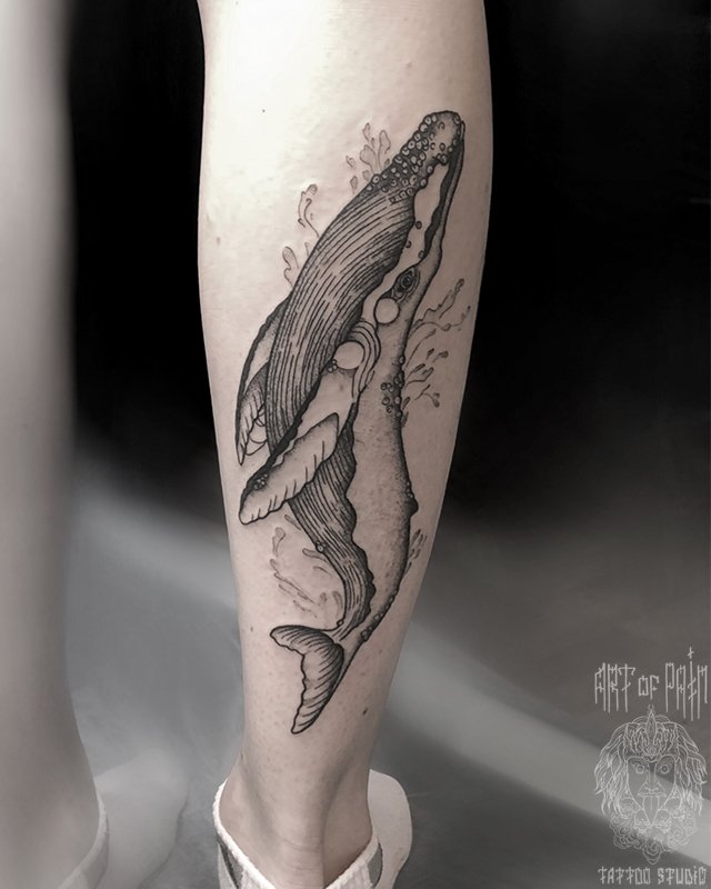 Татуировка женская графика на голени кит 2962