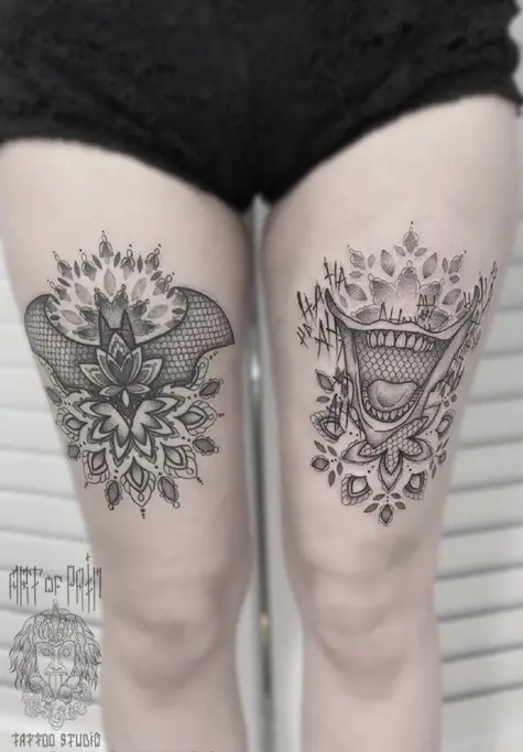 Татуировка женская графика на бедре бетмен в орнаменте 2966