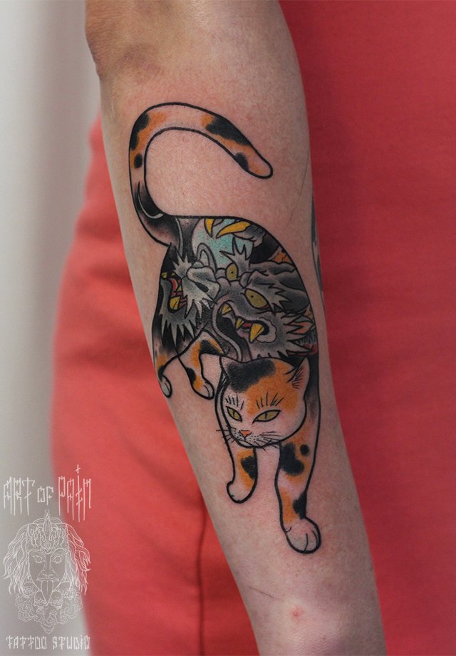 Татуировка женская япония на предплечье котик и дракон 3026