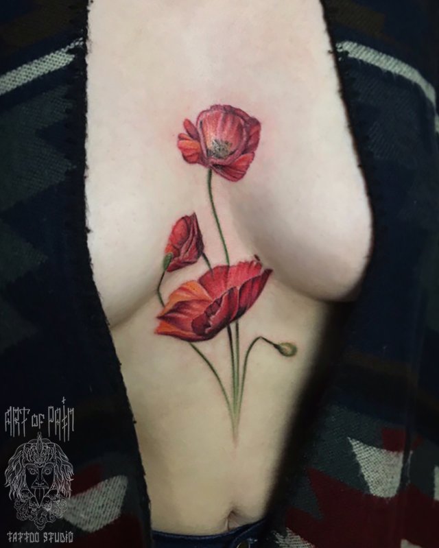 Татуировка женская реализм на груди маки (Юрий Хандрыкин) 3031