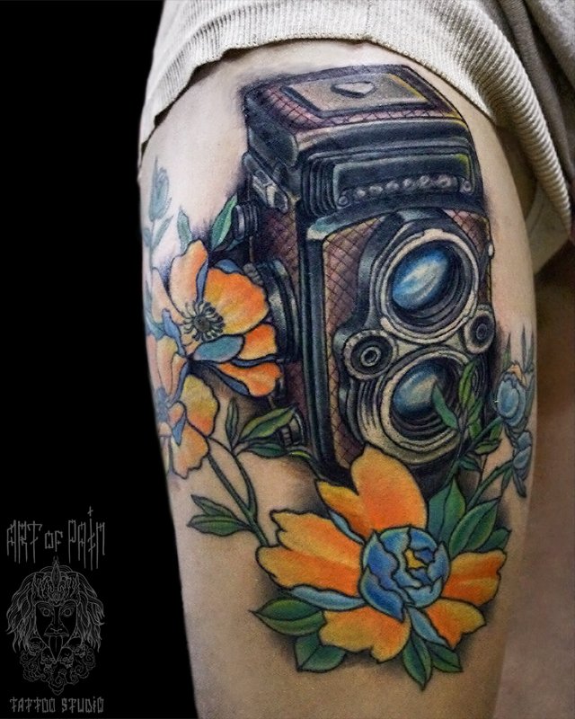 Татуировка женская нью-скул на бедре фотоаппарат и цветы 3042