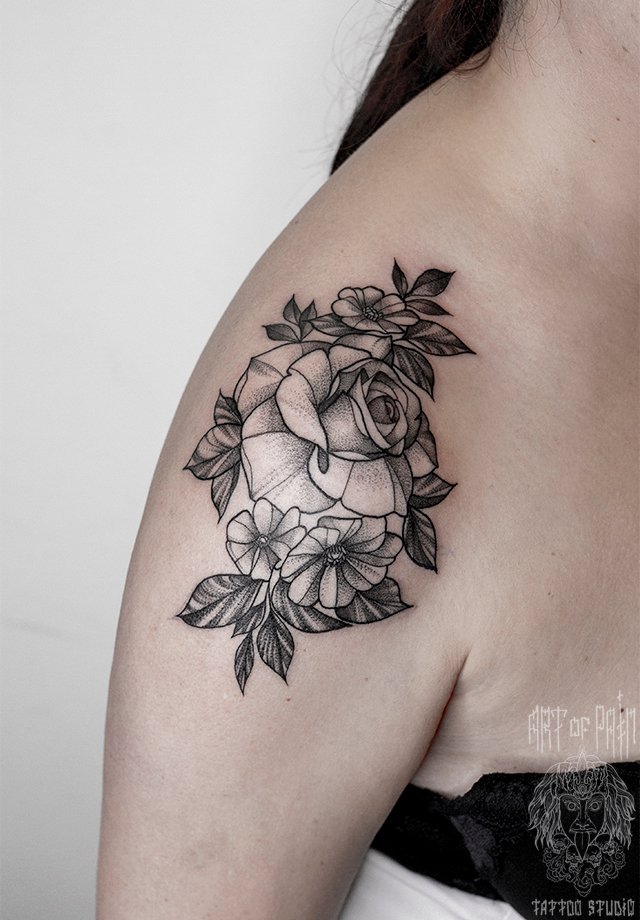 Татуировка женская графика на плече роза и хризантемы 3067