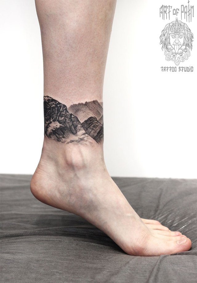 Татуировка женская графика на щиколотке пейзаж 3082