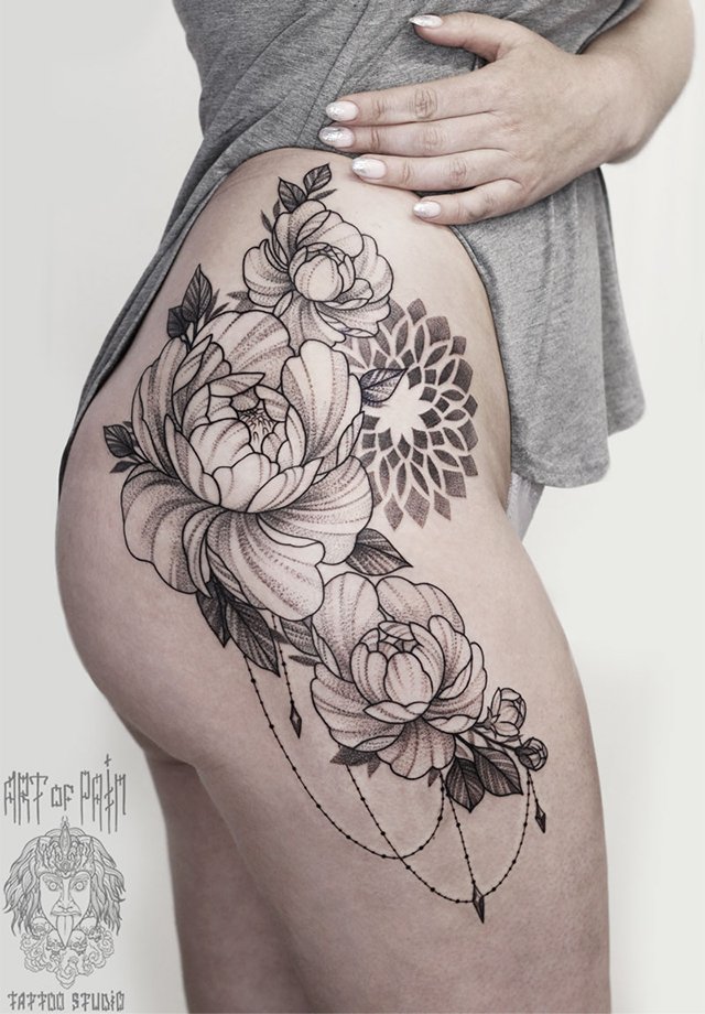 Татуировка женская графика и дотворк на бедре цветы и узор 3083