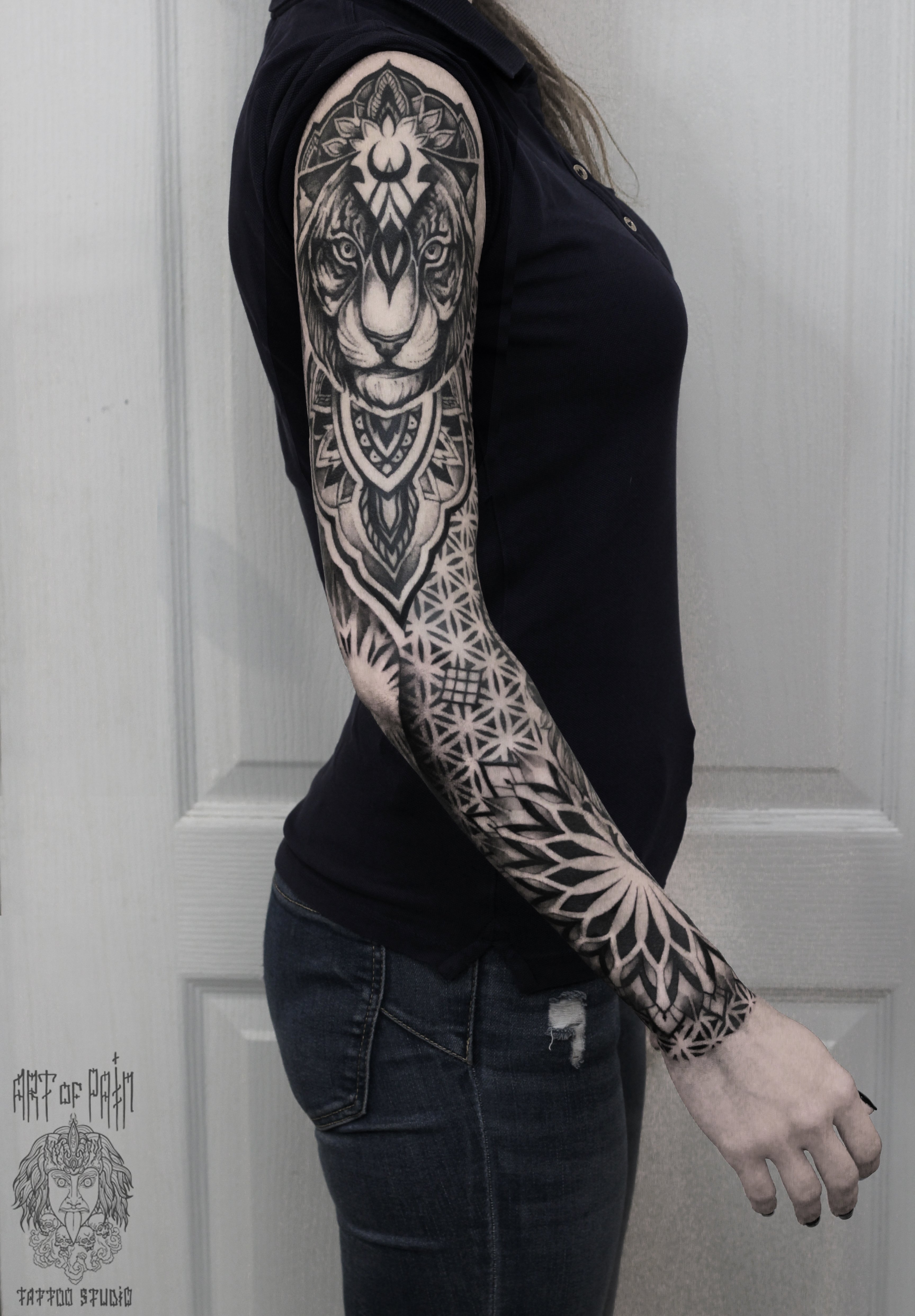 Татуировка женская графика тату-рукав лев и орнамернт 3110