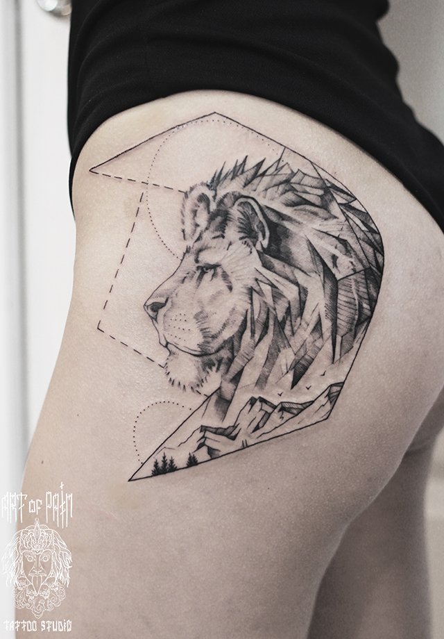 Татуировка женская графика на бедре лев скетч 3150