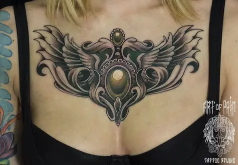 Татуировка женская Black&Grey на груди крылья и камень 316