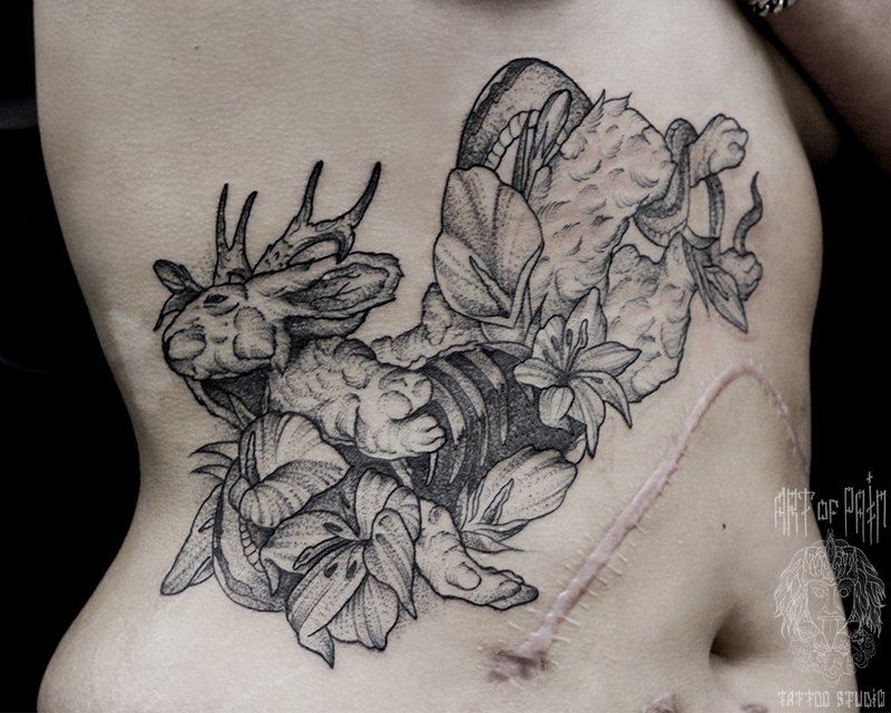 Татуировка женская графика на боку кролик (Юрий Хандрыкин) 3273