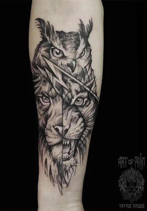 Татуировка женская графика на предплечье лев, тигр и сова 3281