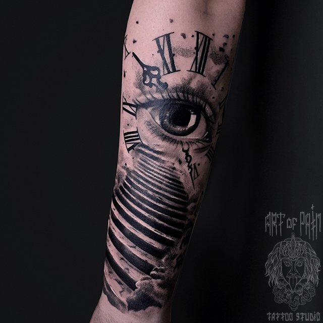 Татуировка женская black&grey на предплечье часы, глаз и лестница (Анастасия Юсупова) 3283