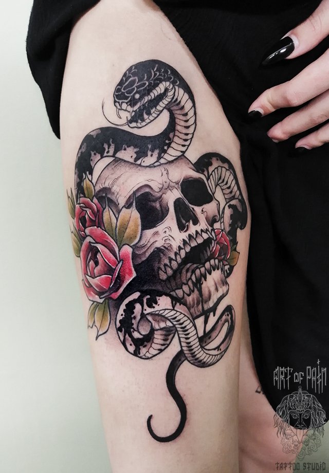 Татуировка женская нью-скул на бедре череп и змея 3361