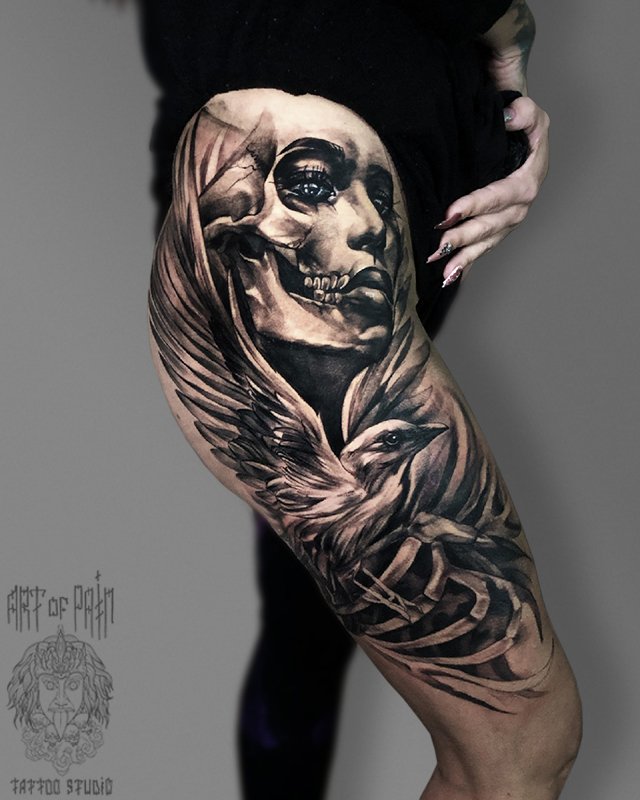 Татуировка женская хоррор на бедре дева-смерть 3396