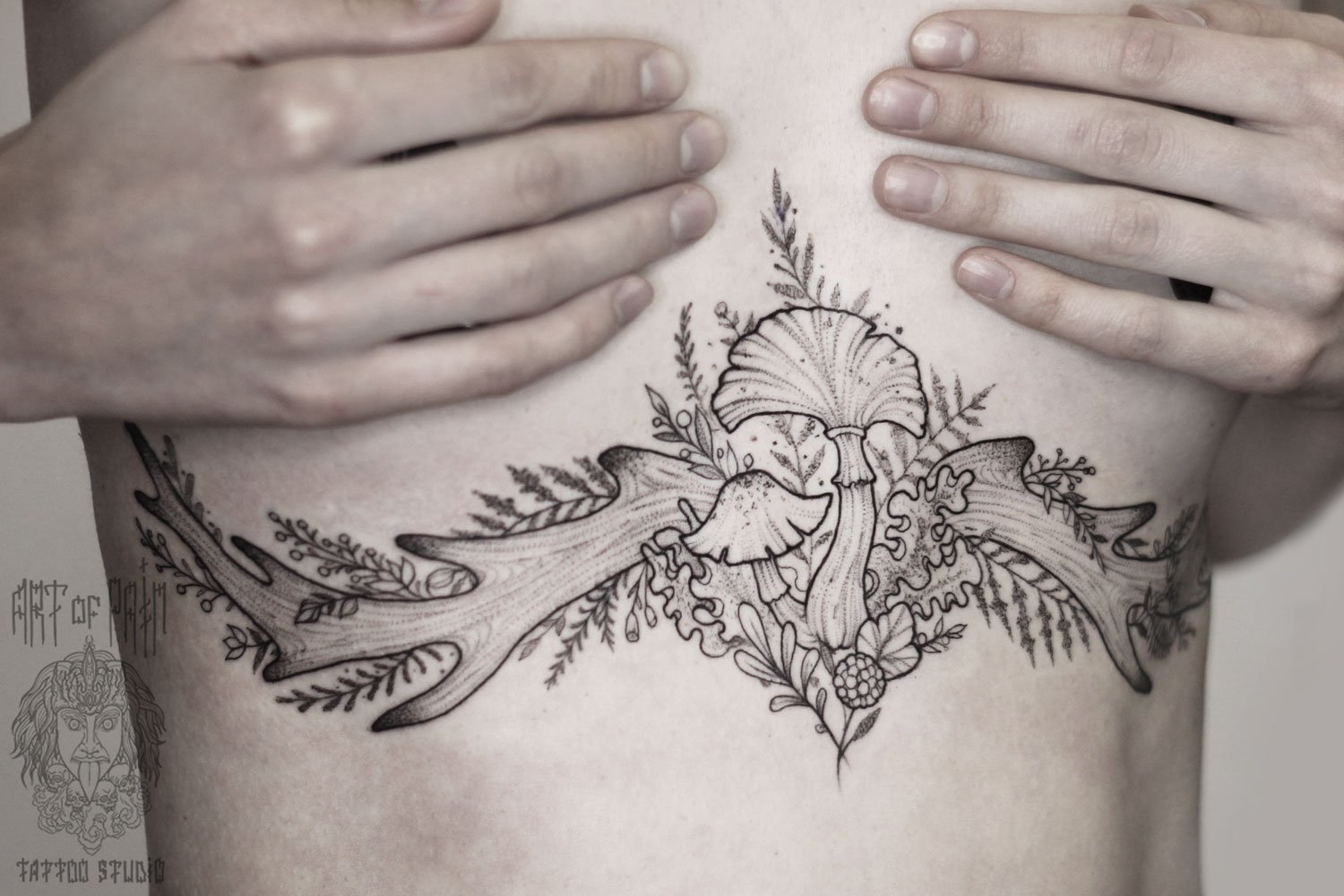 Татуировка женская графика на животе грибы 3408